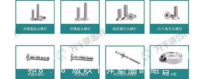1.機螺釘 2.自攻螺釘 3.鉆尾螺釘 4.墻板釘 5.纖維板釘 6.木螺釘7.六角木螺釘 8.不脫出螺釘 9.組合螺釘 10.微型螺釘 11.家具螺釘 12.電子螺釘頭型:1.六角頭(hexagon head) 2.六角頭法蘭面(hexagon head with flange) 3. 高強度螺栓在生產上全稱叫高強度螺栓連接副,一般不簡稱為高強螺栓。 根據安裝特點分為:大六角頭螺栓和扭剪型螺栓。其中扭剪型只在10.9級中使用。根據高強度螺栓的性能等級分為:8.8級和10.9級。其中8.8級僅有大六角