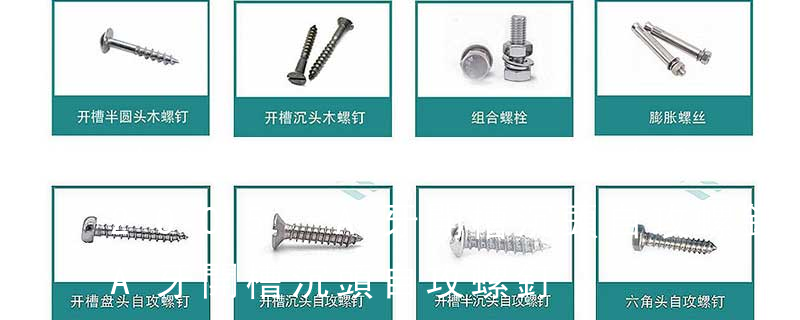 1.機螺釘 2.自攻螺釘 3.鉆尾螺釘 4.墻板釘 5.纖維板釘 6.木螺釘7.六角木螺釘 8.不脫出螺釘 9.組合螺釘 10.微型螺釘 11.家具螺釘 12.電子螺釘 13.鏈帶螺釘頭型 :1.六角頭(hexagon head)2.六角頭法蘭面(